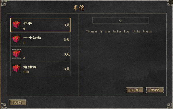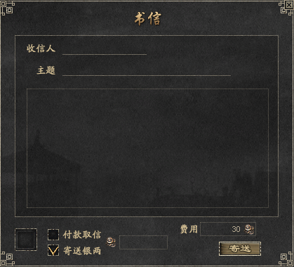 - [发 信]:可以编辑书信发送给他人 - [收信人]:接收书信的玩家游戏名 - [主 题]:信件的主题,普通信件和系统信件题目的字体颜色也会不同 - [删 除] : 删除相应书信,删除后不能恢复书信内容 (书信内有金钱或者物品不可进行删除) - [内 容]:可以编写书信的全部内容 - [附加物品] : 可以放入需要与书信一起发送的物品 - [附加金额] : 可以输入需要与书信一起发送的钱 - [费用]: 发送书信所要使用的手续费 - [寄送] : 以上事项结束后,点击[寄送]按钮,传书鸽将被发送