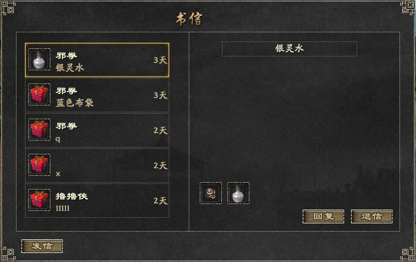 - [观看所收书信] : 双击所收书信的目录上信件的题目就可以查看书信内容 - [目 录] :移到所收书信的目录仓 - [附加物品] : 附加在书信上的装备可以通过点击鼠标点击移到自己的所持仓 - [附加金额] : 附加在书信上的钱可以通过点击鼠标点击核算到自己的所持金里 - [回 复] :可以回复发信人。从拍卖场、装备卖场发送的书信不能回复 - [退 信] : 书信原路返回发信人传书鸽内 - [保 管] : 所有已接收的书信,在保管期结束时自动删除 (新书信 : 30日、 确认的书信: 3日、 装备卖场发出的新书信 : 30日,保管期间一结束,附加的装备也会自动删除。希望注意这一点)