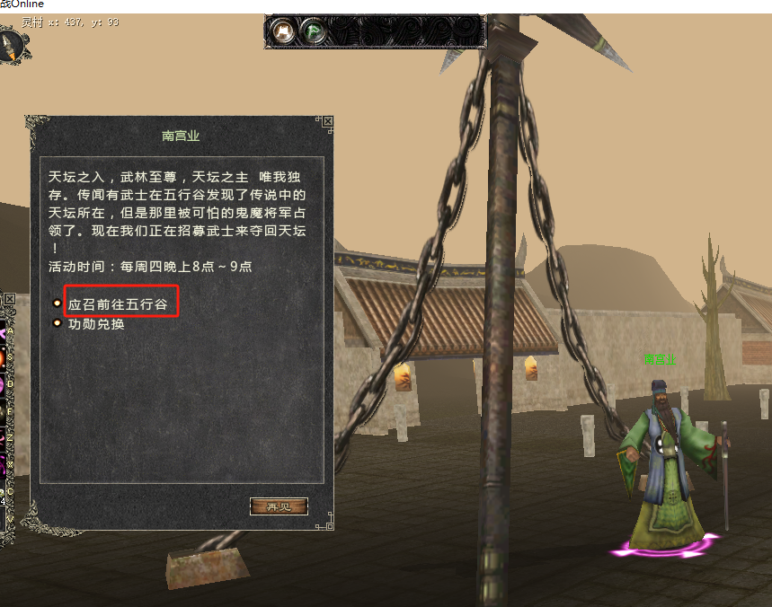 2、鬼魔活动地点:五行谷,从灵村的鬼魔活动NPC处进入,该NPC每周四20点出现,21:30消失;