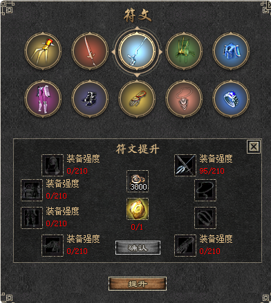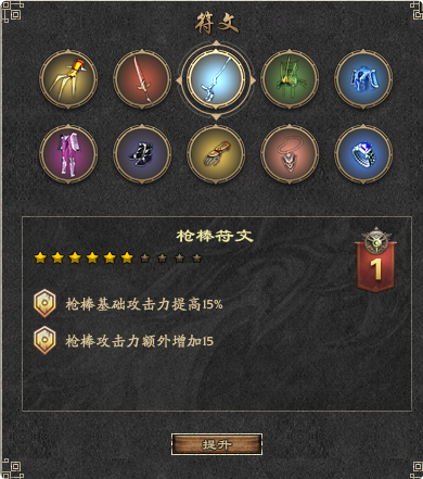 ・符文升阶:符文升到满星后需要符石精华和指定装备达到强度后进行符文升阶,升阶后可继续使用符石进行升星;