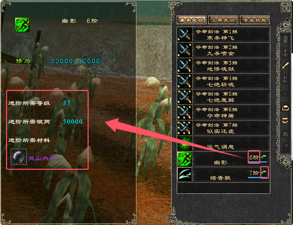 ・学习武功后,可以对武功进行升阶,鼠标移动至“n阶”处可查看升阶武功所需条件,满足条件可点击右边绿色上升箭头进行升阶;