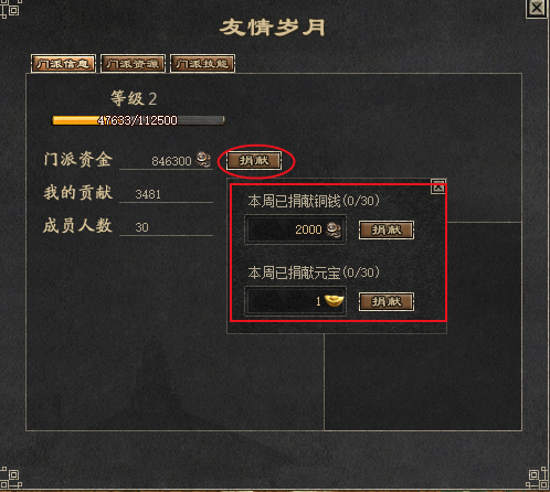 ・进入门派后,可以用铜钱和元宝等进行捐献;