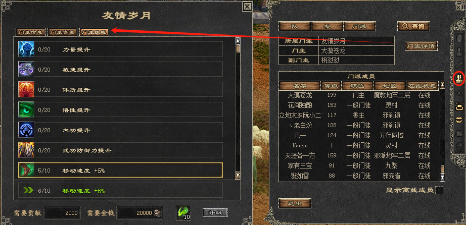 ・捐献值可以提升自己的门派技能,脱离门派后,门派技能仍旧升效;