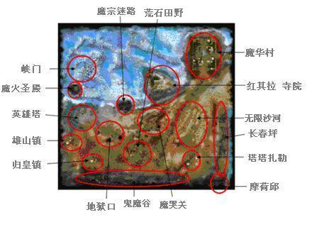 因为是初选魔教时游戏开始的村庄,所以配置着进行游戏所必要的基本NPC。此处会出现整个区域中等级比较低的怪物,并且包含着向五行魔域移动的关口和通向魔教地牢1层的关口。